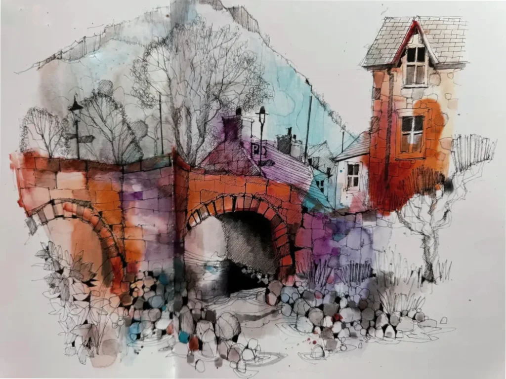 Beddgelert Bridge is a beautifully complex scene — stone arches, river reflections, layered buildings. This course teaches you to break it down, build it up in colour, and finish it with confident pen work. Designed for beginners and improvers.